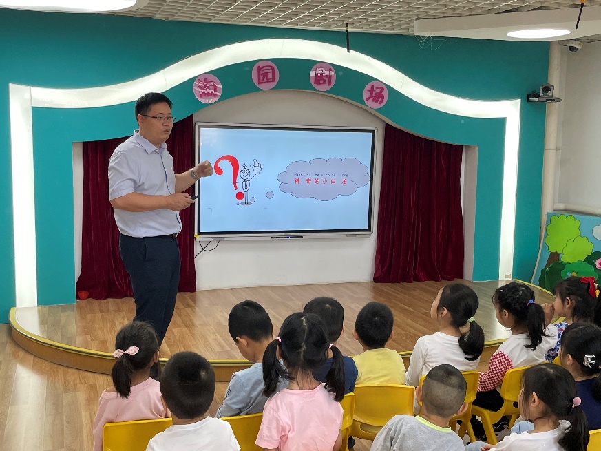 针对学龄前儿童的认知特点,张守连老师做了种种充分而细致的准备。在教学材料上,对演示文稿的全部文字内容进行了拼音注释,消除了小朋友们的认字障碍;在教学内容上,将白乙化烈士的绰号“神奇的小白龙”作为题目开题,成功吸引了小朋友的好奇心和注意力。
