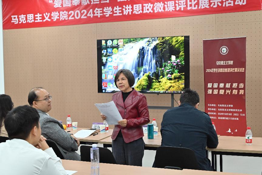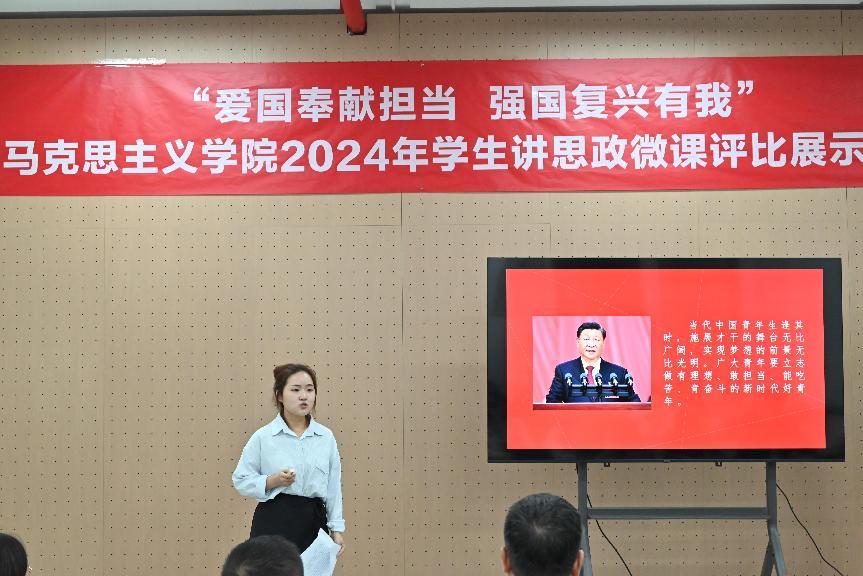 “共产党员的味道”“时光的见证者:七十五载光影里的中国”“为中国式现代化注入‘青春动能’“跨越时空的青春对话”“家书纸短 家国情长”“中国青年 向祖国报到”……同学们紧扣“爱国奉献担当强国复兴有我”主题讲授思政微课,展现马院学子青春风采。