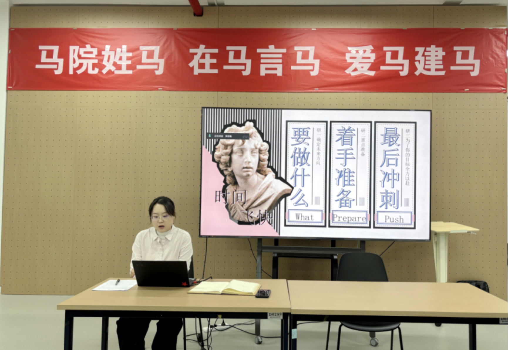 在校友经验分享环节,任职人大附中亦庄新城学校思政课教师的2022级校友王琳琳,结合自身经历,分享了思政课教师岗位应聘从备课准备到现场考核各方面注意事项及复习重点,建议同学们加强日常宣讲实践和专业知识积累。中国社会科学院大学在读博士的2022级校友陈修琪、中央民族大学在读博士的2022级校友刘骋霄,从备考时间点把握、复习文献选择、高质量论文发表、申博材料准备、学校和专业方向选择等方面分享了考博经验,鼓励同学们早规划、强基础、重积累,以积极向上、稳定乐观的心态应试,帮助同学们进一步明确自己未来的发展方向。
