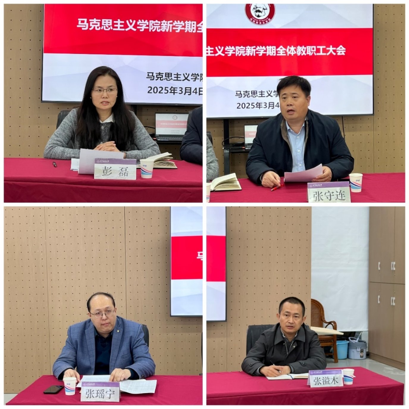 彭磊传达了2025年学校务虚会、年度工作会和安全稳定会等相关会议精神,对意识形态和安全稳定工作做了进一步强调。对学院重点工作进行明确和部署,指出2025年首要任务为高标准通过北京市重点建设马院验收,建成北京市重点马院,要着力做好“十五五”规划制定、规章制度建设、思政课教学质量提升、人民城市大思政课建设、数字思政建设等各项工作,进一步提升科研能力水平,持续加强马院特色项目建设和人才队伍建设,不断优化师生工作学习环境。她强调,全体老师一要进一步坚定理想信念,发挥好思想引领作用;二要加强师德师风建设,重视提升个人师德水平;三要统筹做好教学科研工作,提升教学科研水平;四要积极参与学院建设,共谋发展大计。
