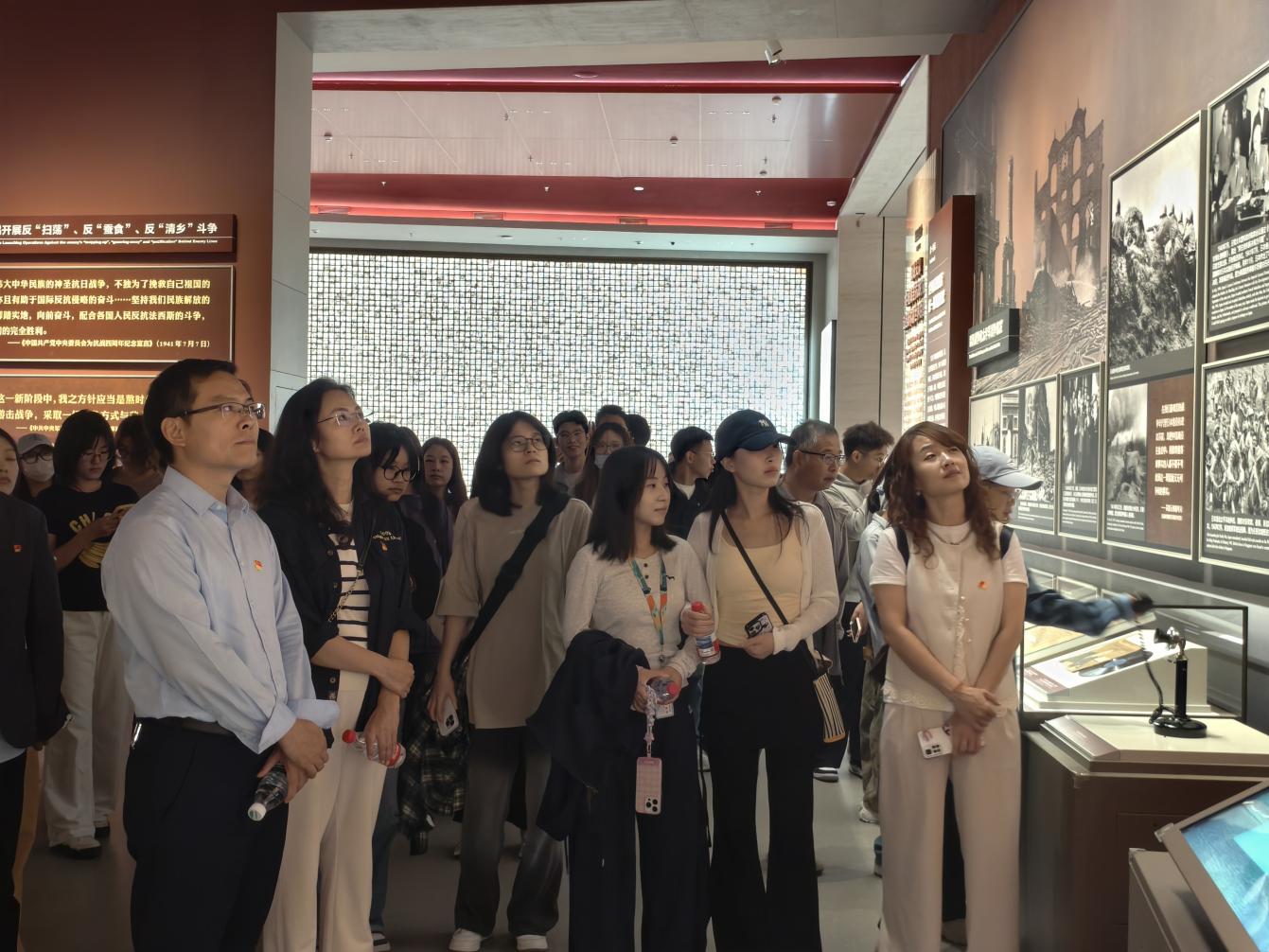 中国人民抗日战争纪念馆是全面反映中国人民抗日战争历史的大型综合性专题纪念馆。在纪念馆讲解员的引导下,全体人员怀着肃穆的心情进入展区。从“九一八事变”的山河破碎,到“七七事变”的全面抗战爆发;从平型关大捷打破“日军不可战胜”的神话,到百团大战激扬“奋斗有我”的铿锵志气;从无数先烈以身殉国的英雄壮举,到中华民族众志成城、浴血奋战的壮阔史诗。大量珍贵的历史照片、文物雕塑结合现代数字多媒体影像,生动再现了14年抗日战争的艰辛历程与伟大胜利。在参观过程中,师生党员深刻认识到中国共产党在捍卫民族独立、维护民族利益、反抗外来侵略中展现出的坚定信念与英勇担当。
